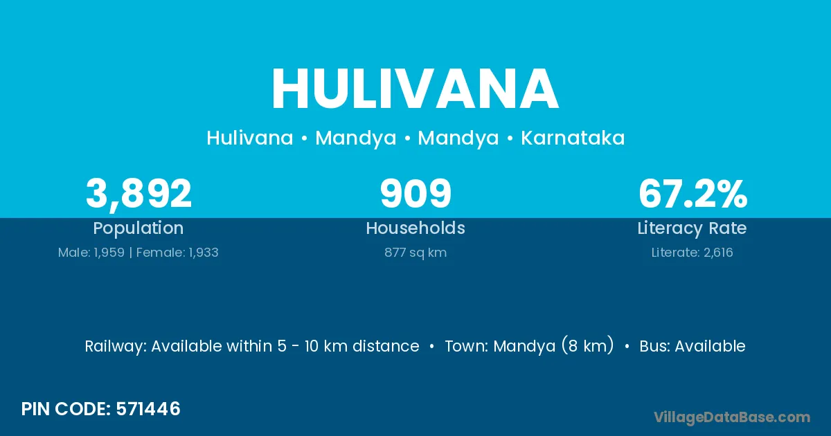 Kunigal (21 km) is the nearest town to Hulivana village for major economic activities and is located approximately 21 km away.