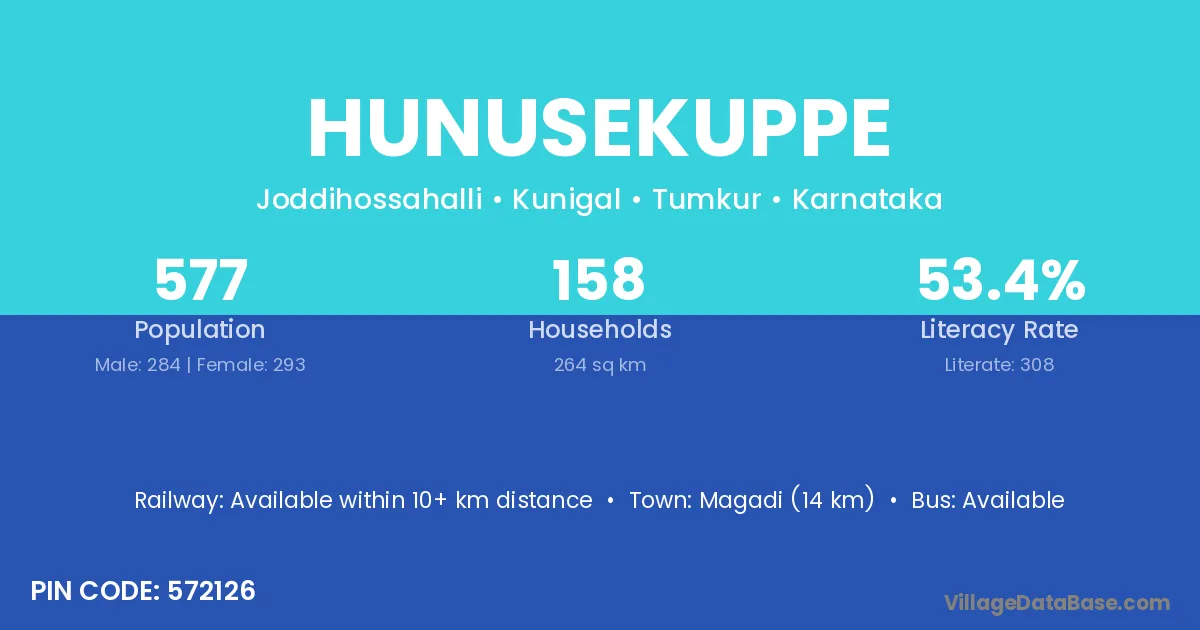 Magadi (14 km) is the nearest town to Hunusekuppe village for major economic activities and is located approximately 14 km away.
