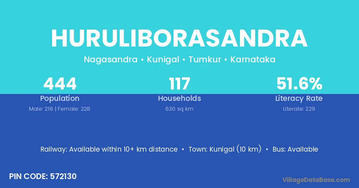 Kunigal (10 km) is the nearest town to Huruliborasandra village for major economic activities and is located approximately 10 km away.