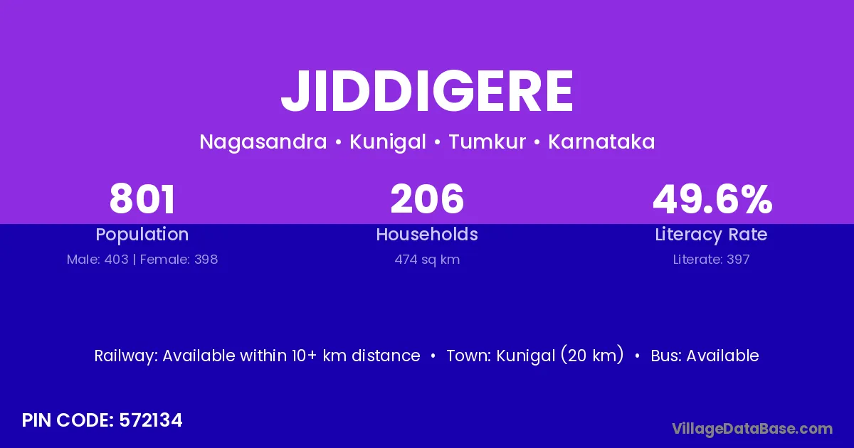 Kunigal (20 km) is the nearest town to Jiddigere village for major economic activities and is located approximately 20 km away.