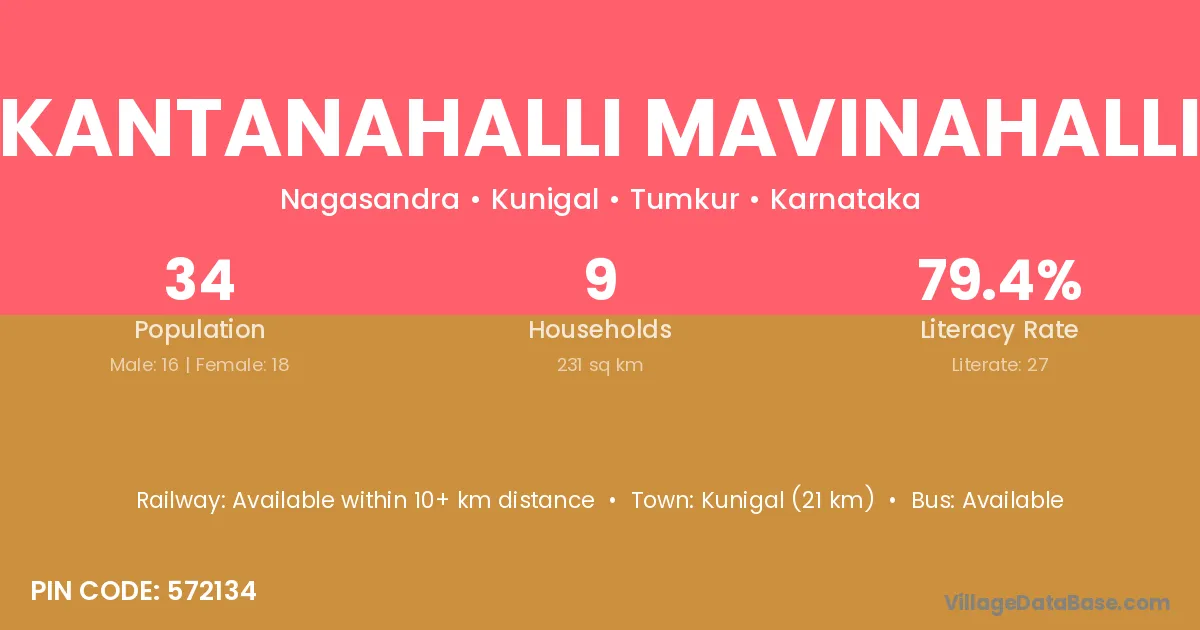 Kantanahalli Mavinahalli village has a total population of 34 people, of which 16 are males and 18 are females.
