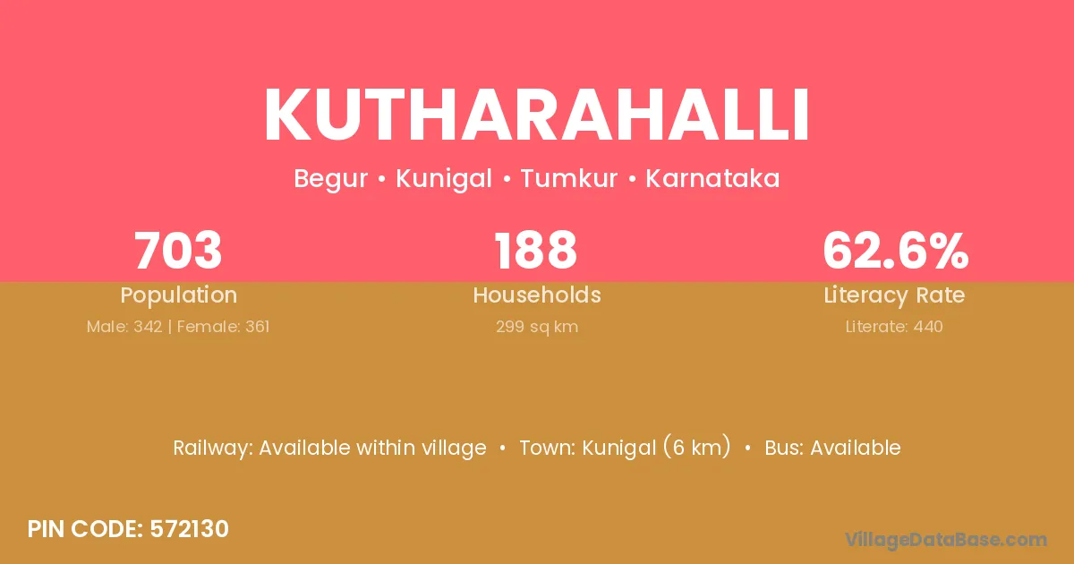 Kutharahalli village has a total population of 703 people, of which 342 are males and 361 are females.
