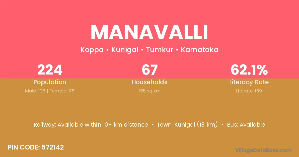 Kunigal (18 km) is the nearest town to Manavalli village for major economic activities and is located approximately 18 km away.