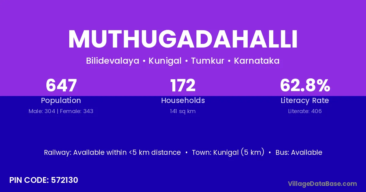 Kunigal (5 km) is the nearest town to Muthugadahalli village for major economic activities and is located approximately 5 km away.