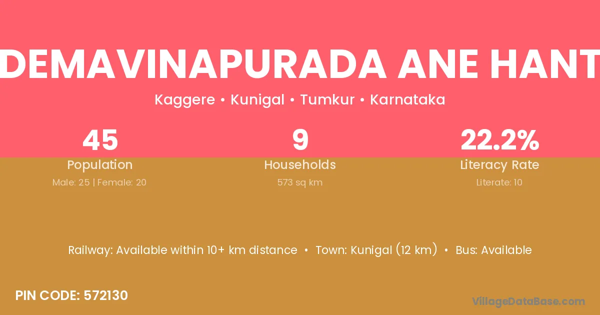Nademavinapurada Ane Hantha village has a total population of 45 people, of which 25 are males and 20 are females.