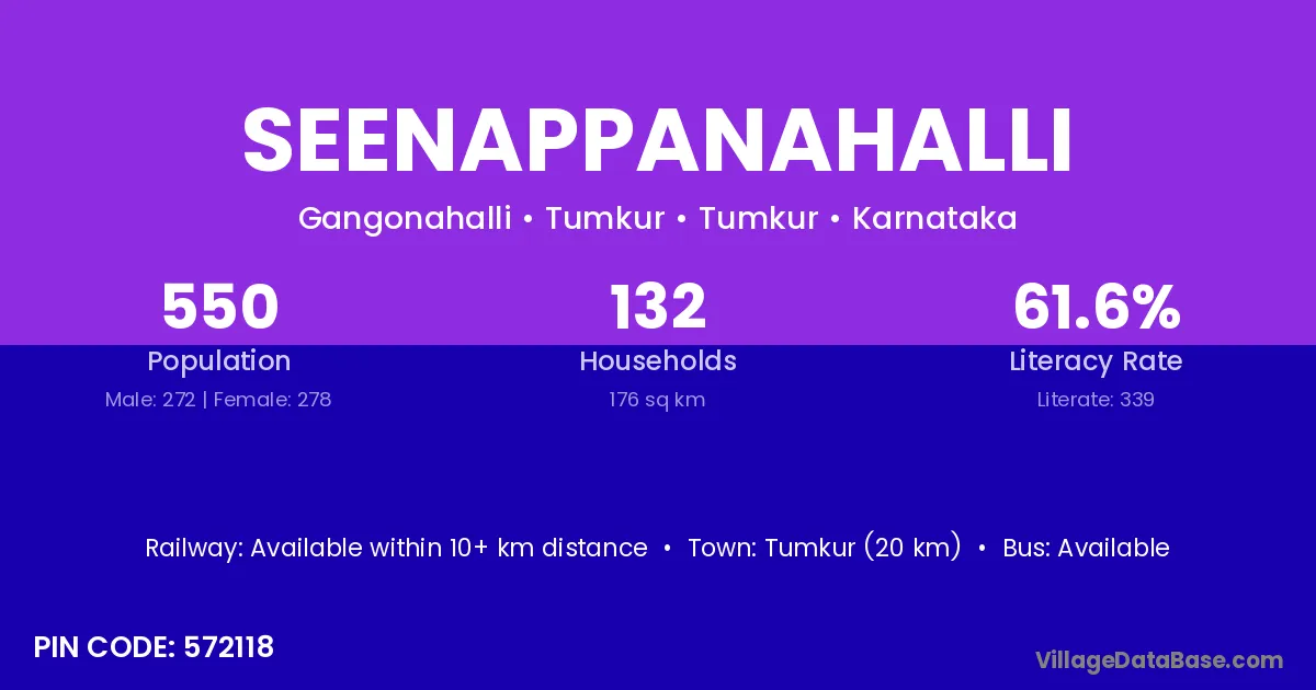 Kunigal (15 km) is the nearest town to Seenappanahalli village for major economic activities and is located approximately 15 km away.