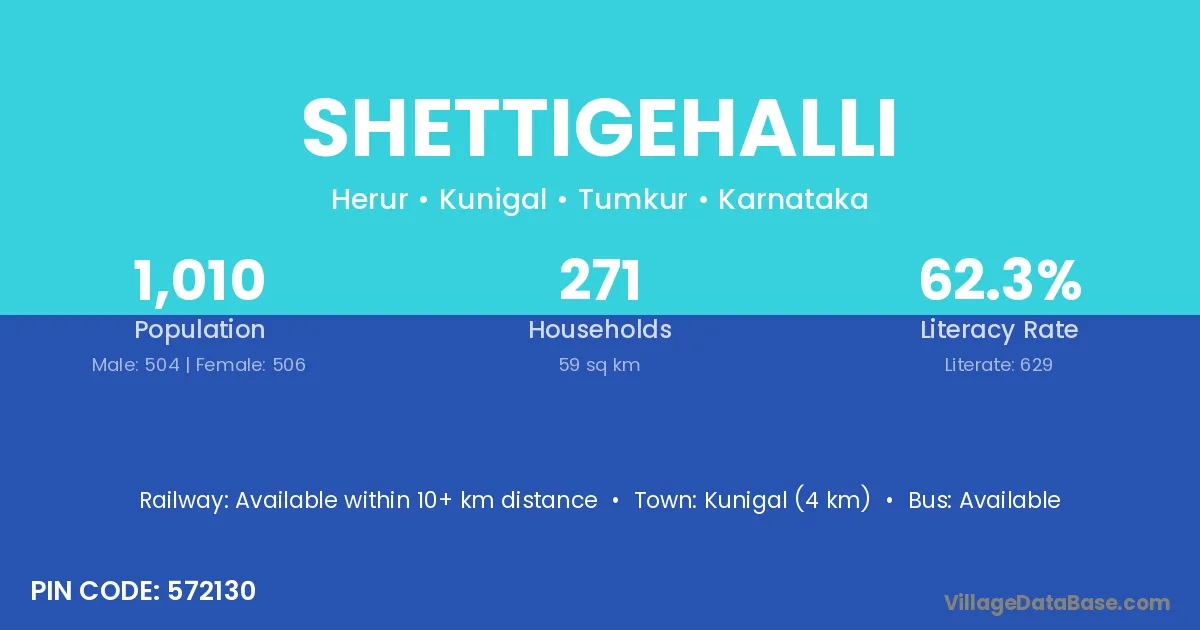 Shettigehalli village has a total population of 1,010 people, of which 504 are males and 506 are females.