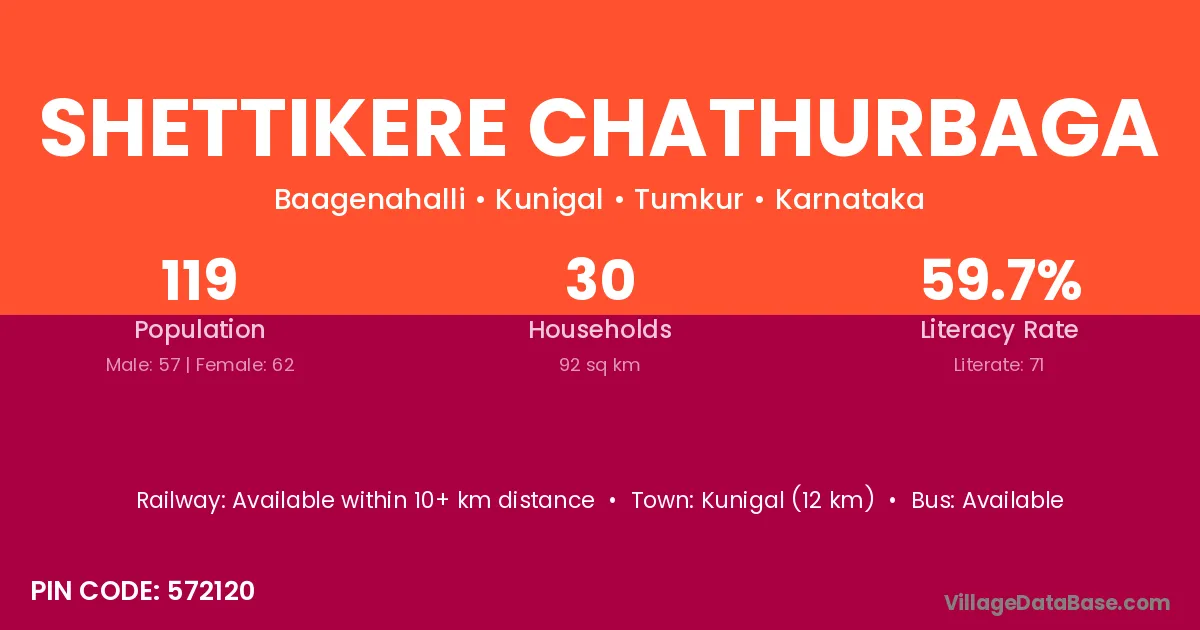 Shettikere Chathurbaga village has a total population of 119 people, of which 57 are males and 62 are females.