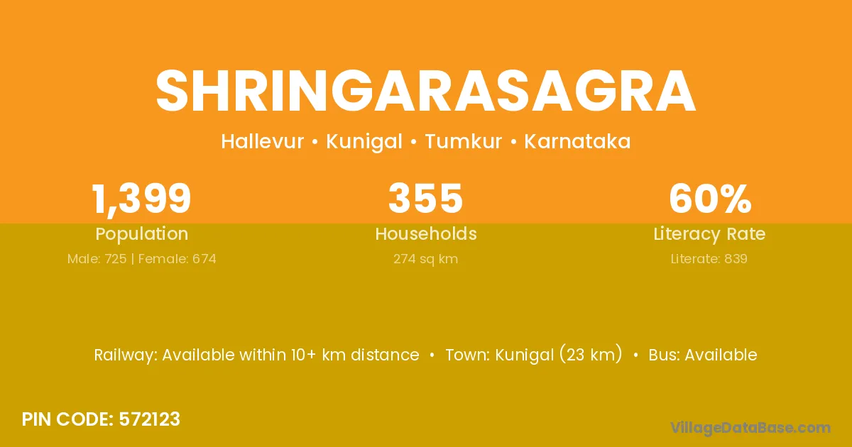 Kunigal (23 km) is the nearest town to Shringarasagra village for major economic activities and is located approximately 23 km away.