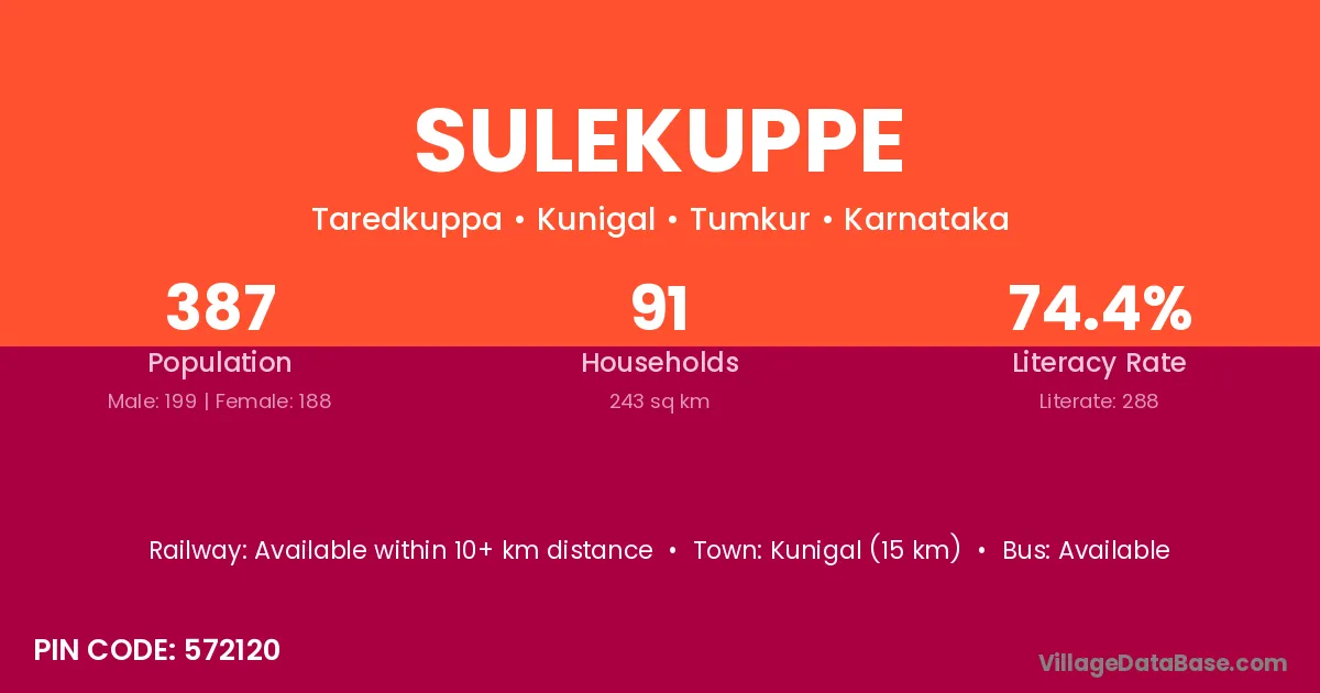 Kunigal (15 km) is the nearest town to Sulekuppe village for major economic activities and is located approximately 15 km away.