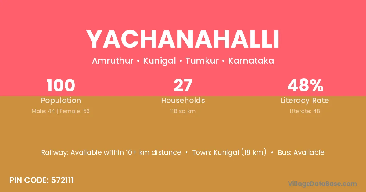 Kunigal (18 km) is the nearest town to Yachanahalli village for major economic activities and is located approximately 18 km away.