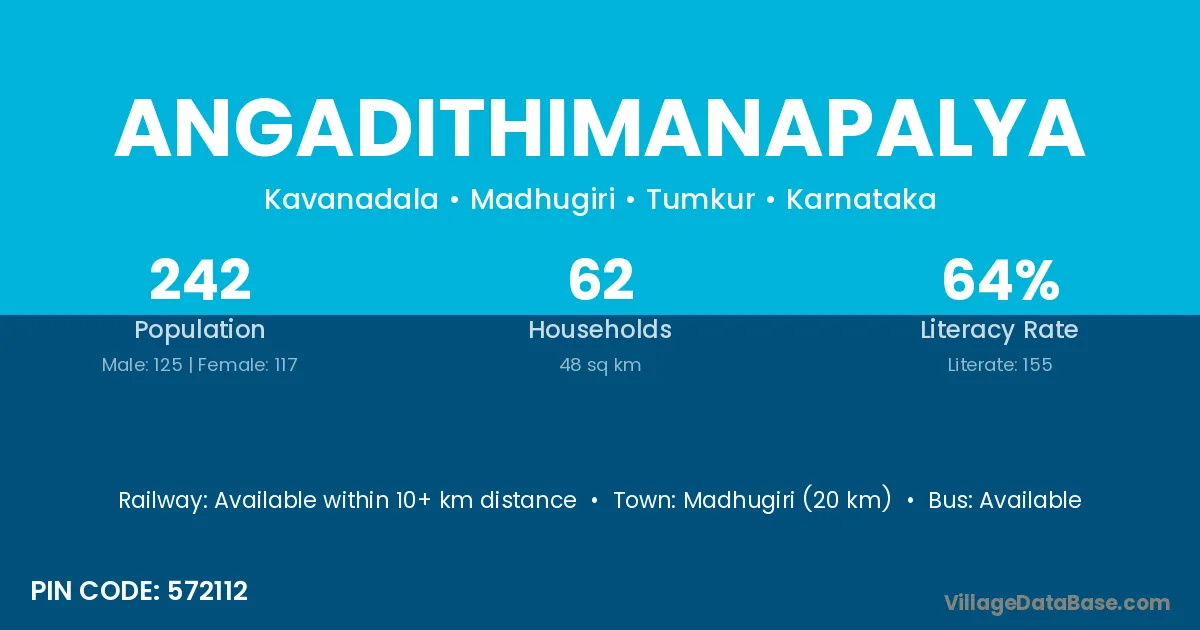 Madhugiri (20 km) is the nearest town to Angadithimanapalya village for major economic activities and is located approximately 20 km away.