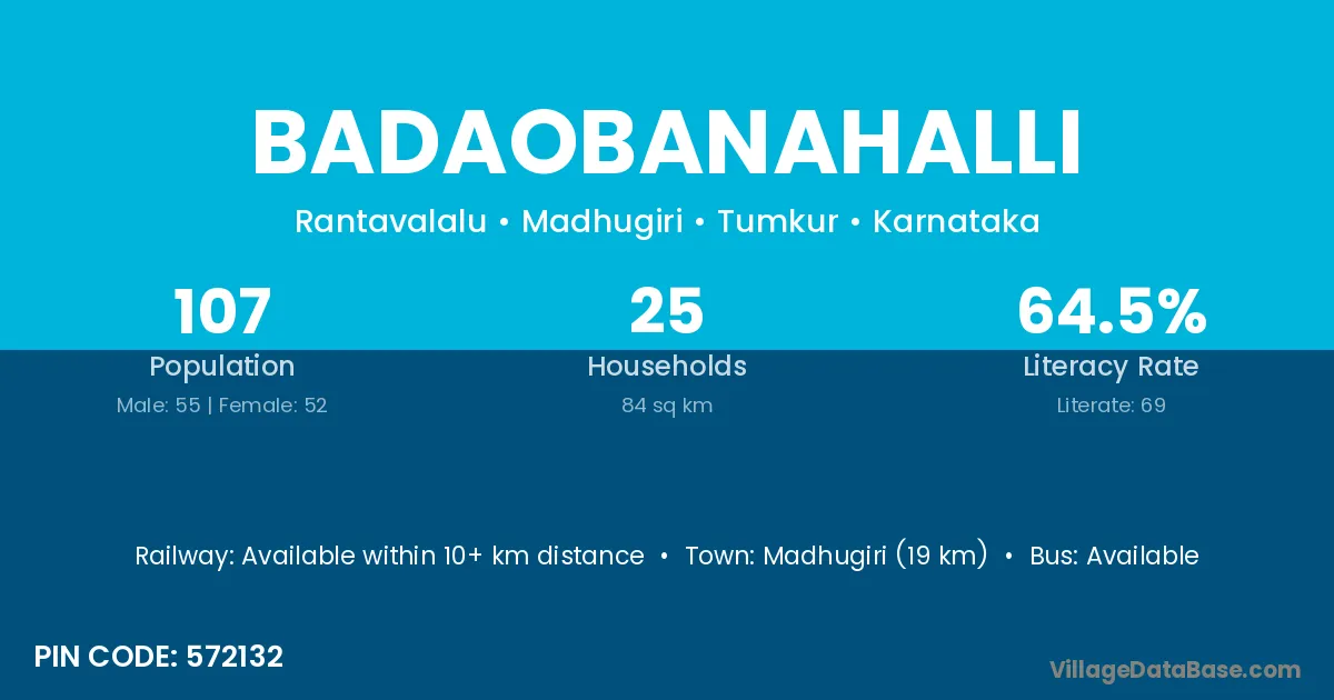 Madhugiri (19 km) is the nearest town to Badaobanahalli village for major economic activities and is located approximately 19 km away.