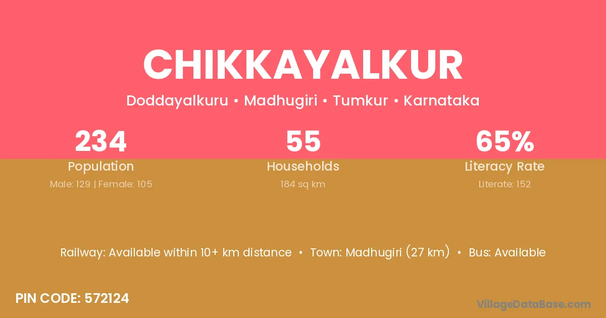 Madhugiri (27 km) is the nearest town to Chikkayalkur village for major economic activities and is located approximately 27 km away.