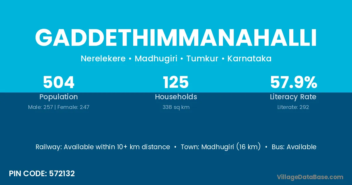 Madhugiri (16 km) is the nearest town to Gaddethimmanahalli village for major economic activities and is located approximately 16 km away.