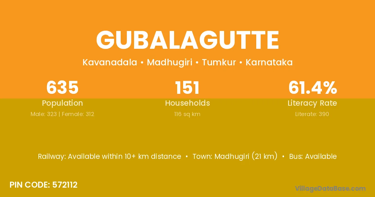 Madhugiri (21 km) is the nearest town to Gubalagutte village for major economic activities and is located approximately 21 km away.