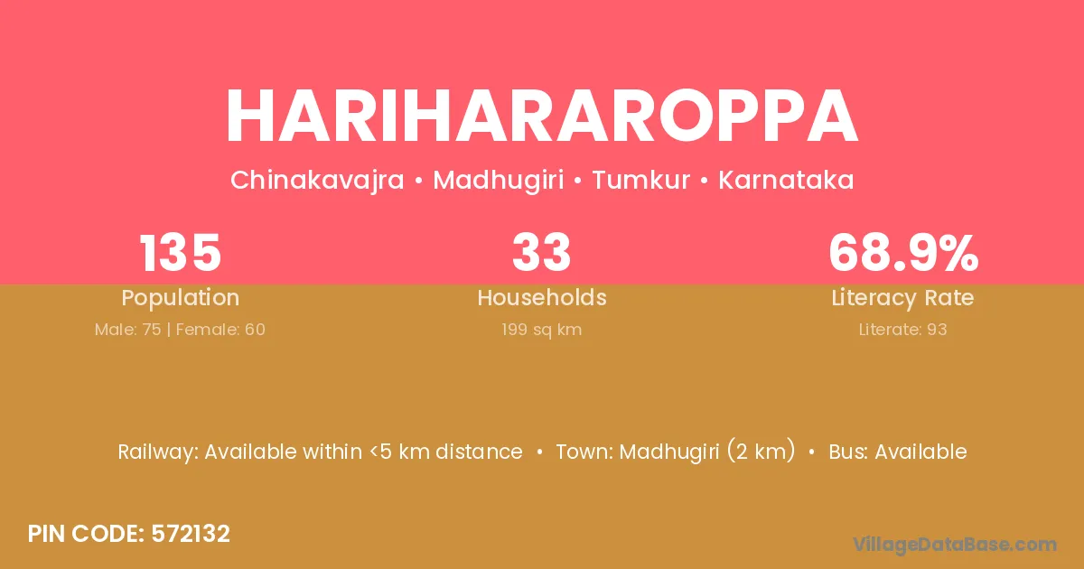 Madhugiri (2 km) is the nearest town to Harihararoppa village for major economic activities and is located approximately 2 km away.