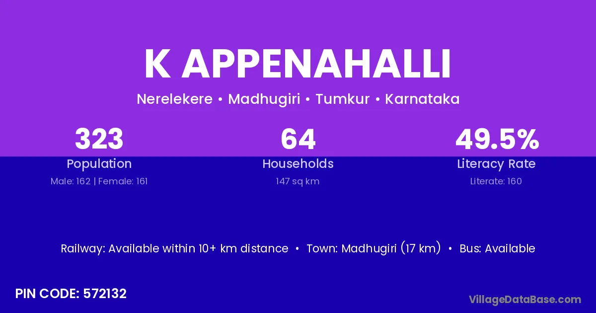 Madhugiri (17 km) is the nearest town to K Appenahalli village for major economic activities and is located approximately 17 km away.