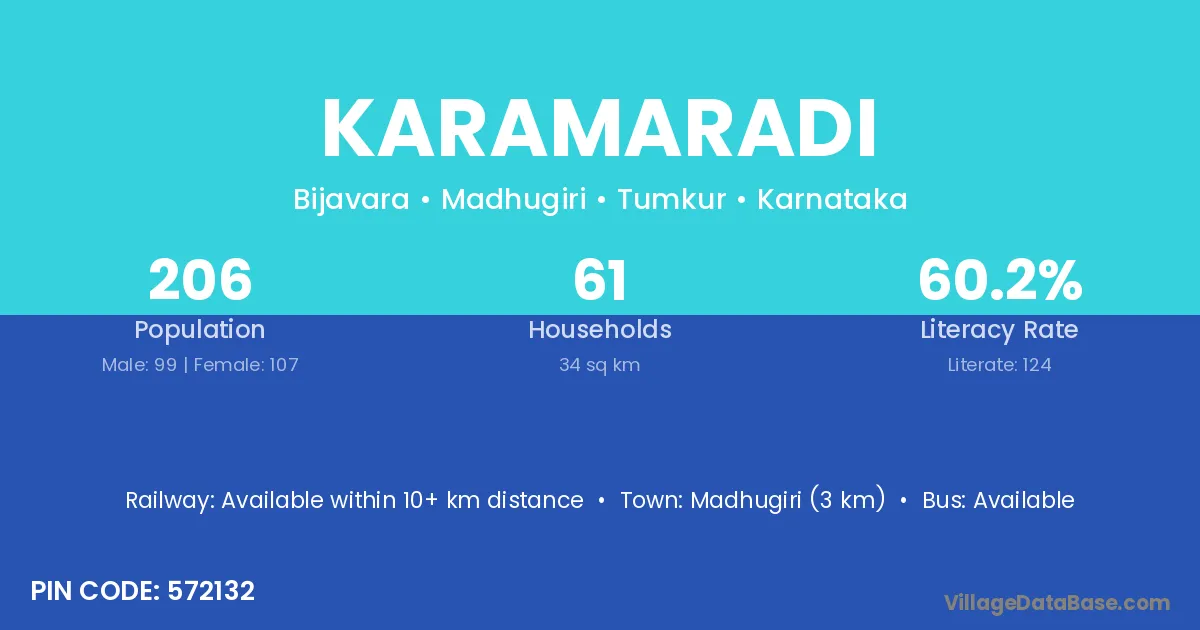 Madhugiri (3 km) is the nearest town to Karamaradi village for major economic activities and is located approximately 3 km away.
