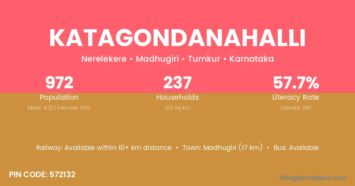Madhugiri (17 km) is the nearest town to Katagondanahalli village for major economic activities and is located approximately 17 km away.
