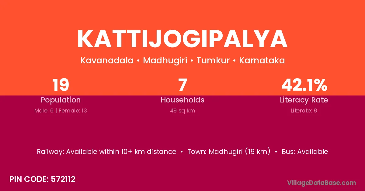 Madhugiri (19 km) is the nearest town to Kattijogipalya village for major economic activities and is located approximately 19 km away.