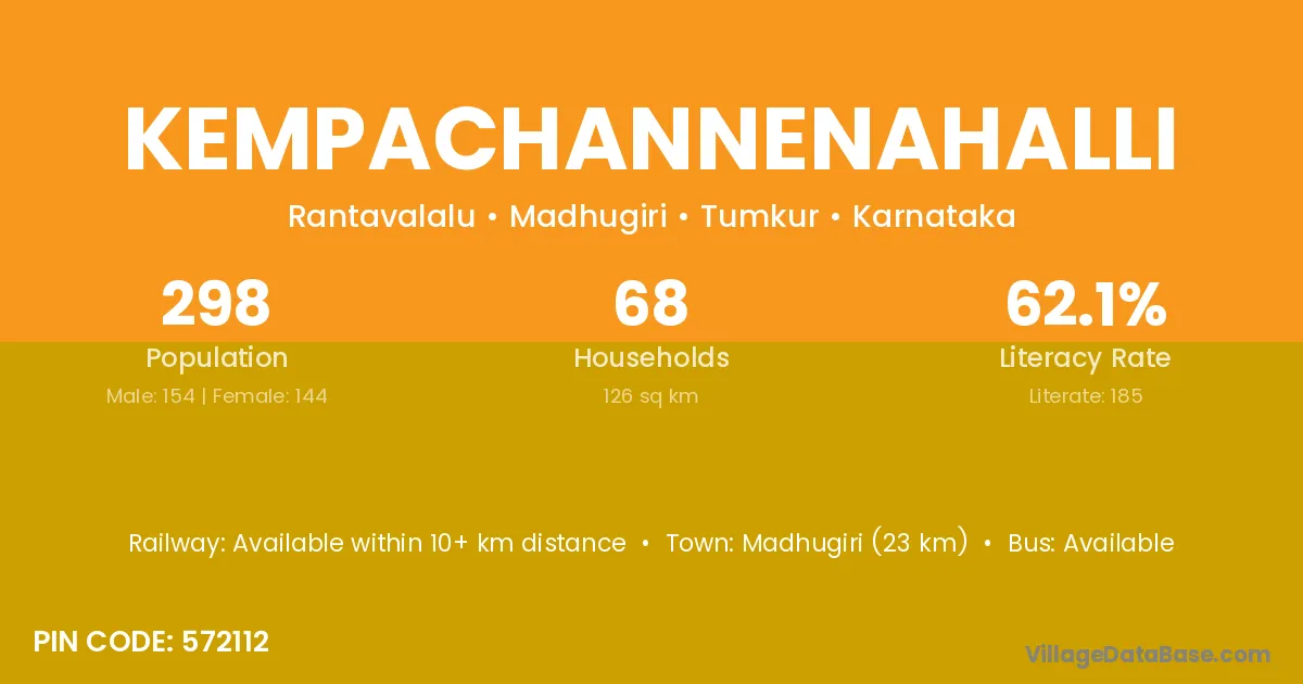 Madhugiri (23 km) is the nearest town to Kempachannenahalli village for major economic activities and is located approximately 23 km away.