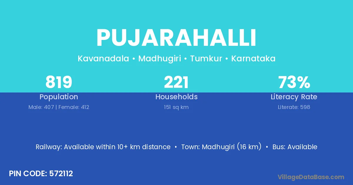 Madhugiri (16 km) is the nearest town to Pujarahalli village for major economic activities and is located approximately 16 km away.