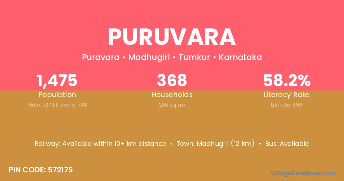 Madhugiri (12 km) is the nearest town to Puruvara village for major economic activities and is located approximately 12 km away.