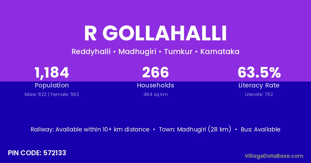 Madhugiri (28 km) is the nearest town to R Gollahalli village for major economic activities and is located approximately 28 km away.