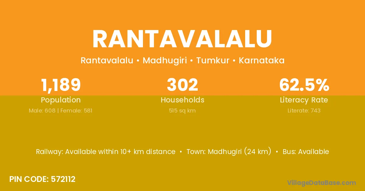 Madhugiri (24 km) is the nearest town to Rantavalalu village for major economic activities and is located approximately 24 km away.