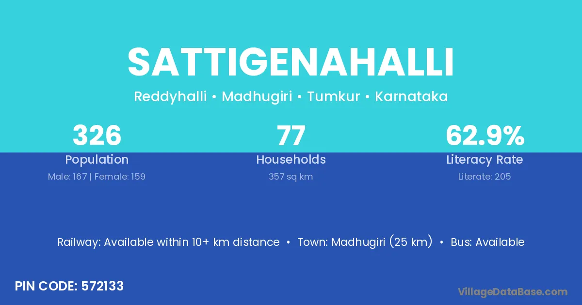 Madhugiri (25 km) is the nearest town to Sattigenahalli village for major economic activities and is located approximately 25 km away.
