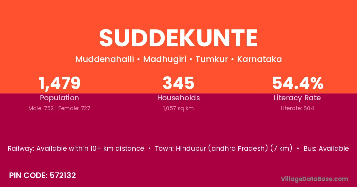 Hindupur (andhra Pradesh) (7 km) is the nearest town to Suddekunte village for major economic activities and is located approximately 7 km away.