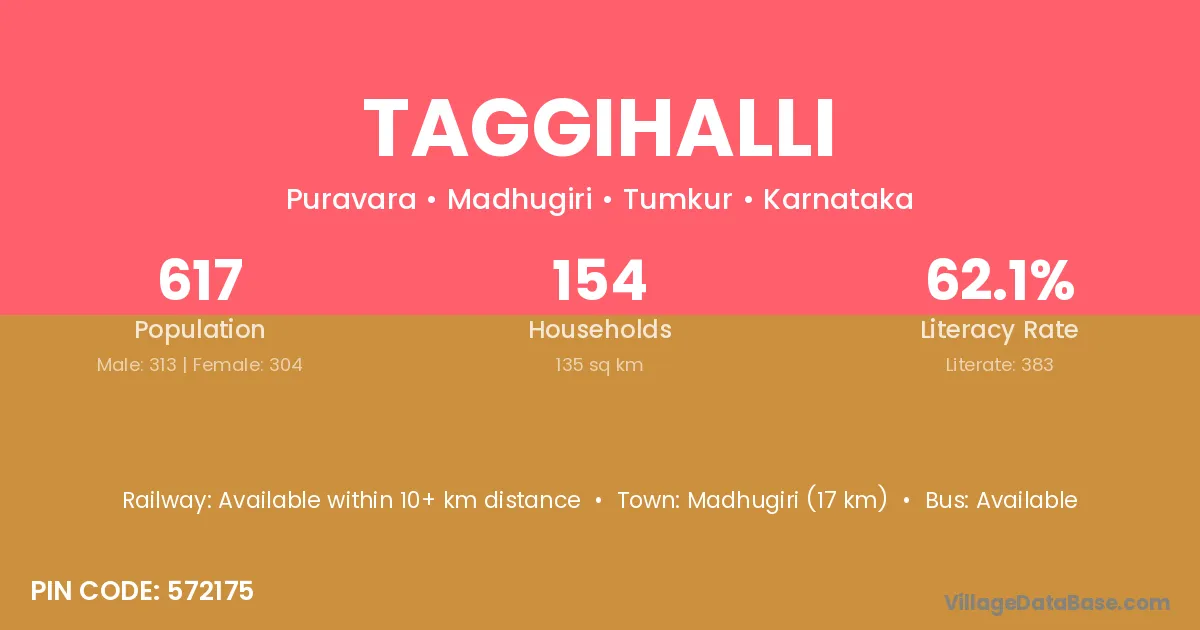 Madhugiri (17 km) is the nearest town to Taggihalli village for major economic activities and is located approximately 17 km away.
