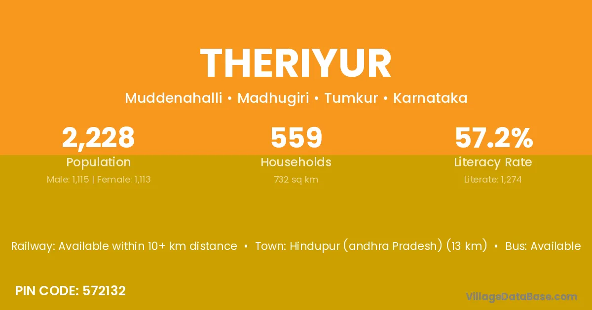 Hindupur (andhra Pradesh) (13 km) is the nearest town to Theriyur village for major economic activities and is located approximately 13 km away.