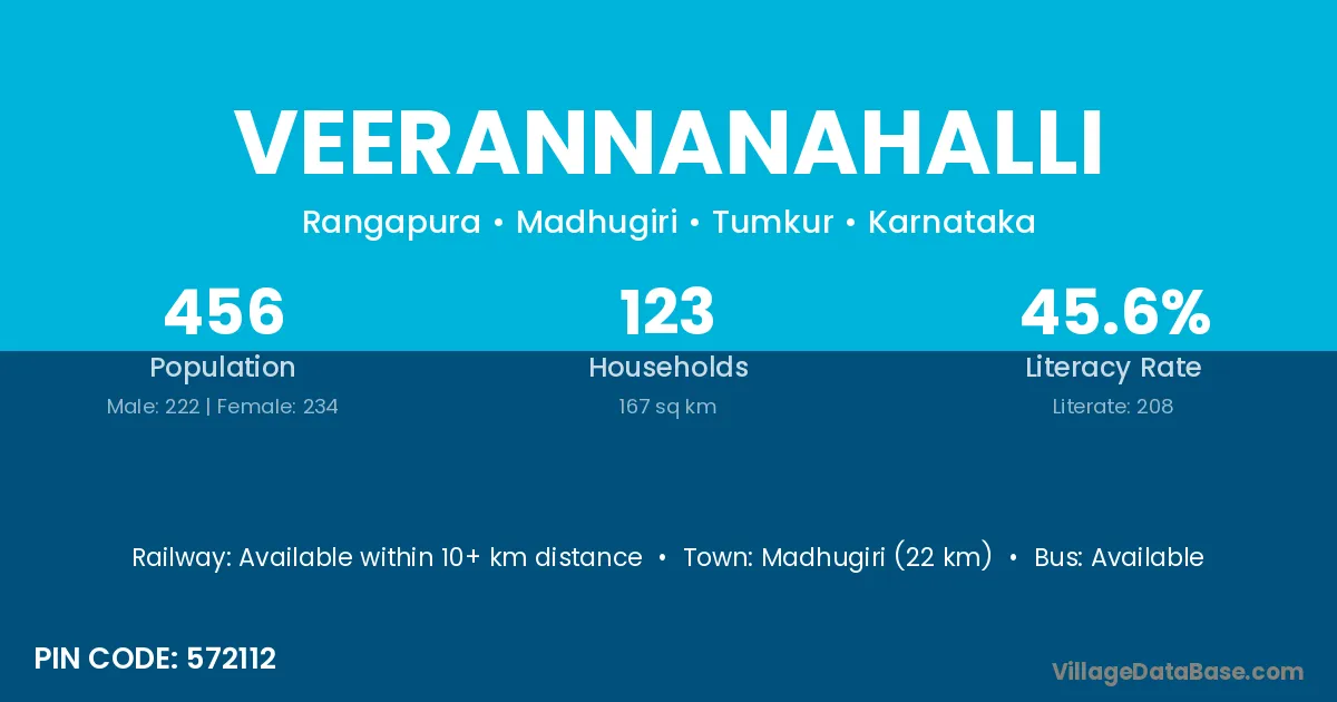 Madhugiri (22 km) is the nearest town to Veerannanahalli village for major economic activities and is located approximately 22 km away.