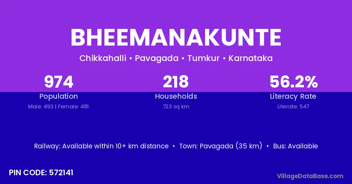 Bheemanakunte village has a total population of 974 people, of which 493 are males and 481 are females.
