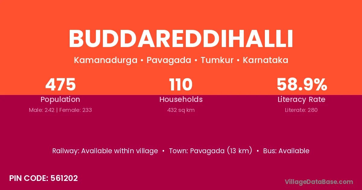 Pavagada (13 km) is the nearest town to Buddareddihalli village for major economic activities and is located approximately 13 km away.