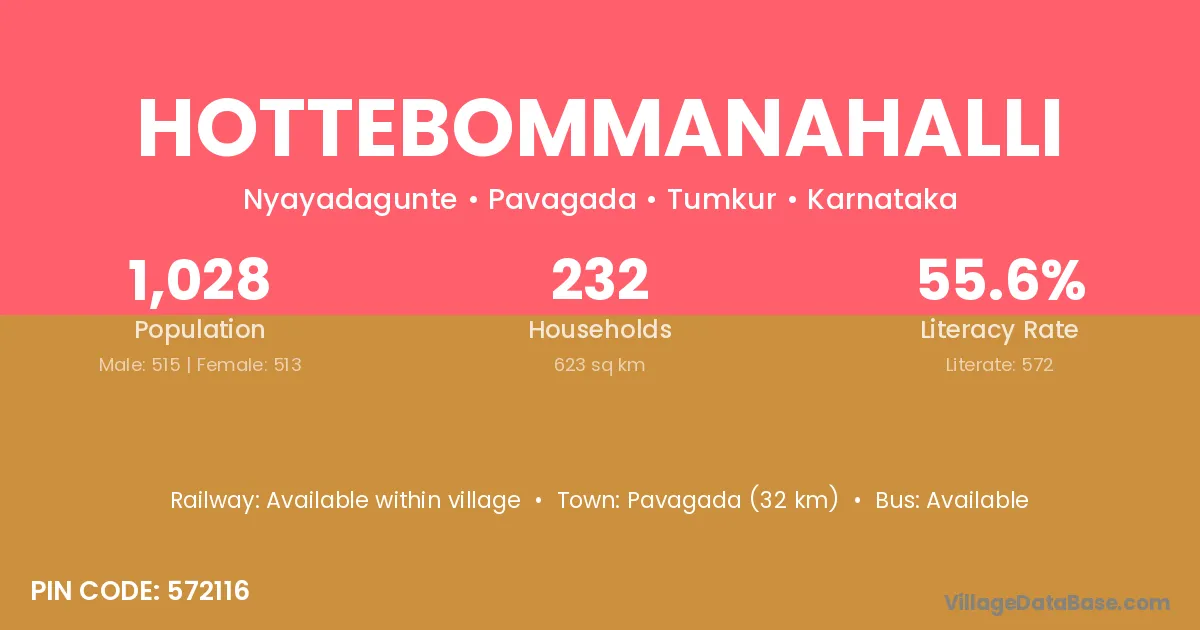 Hottebommanahalli village has a total population of 1,028 people, of which 515 are males and 513 are females.