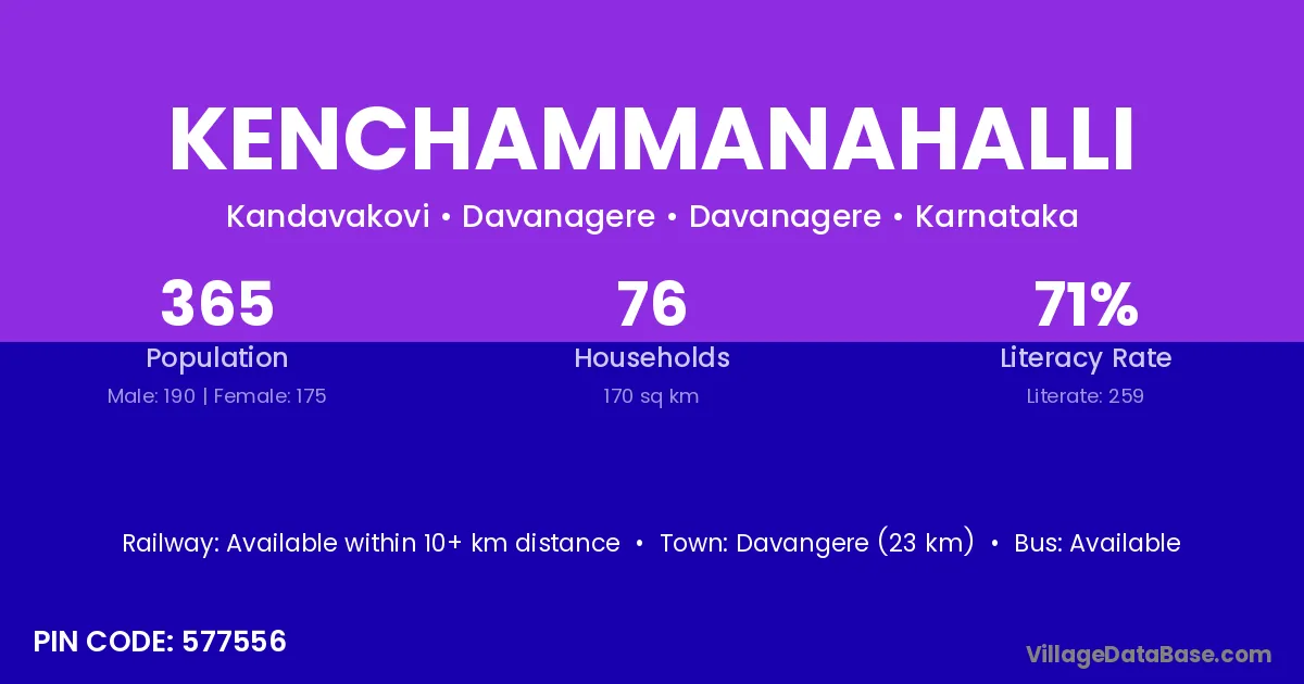 The literacy rate of Kenchammanahalli village is 60.06%. Male literacy stands at 69.47% and female literacy at 50.34%.