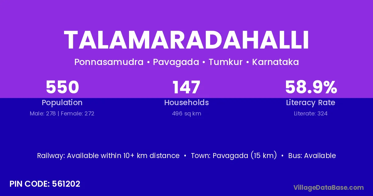Talamaradahalli village has a total population of 550 people, of which 278 are males and 272 are females.