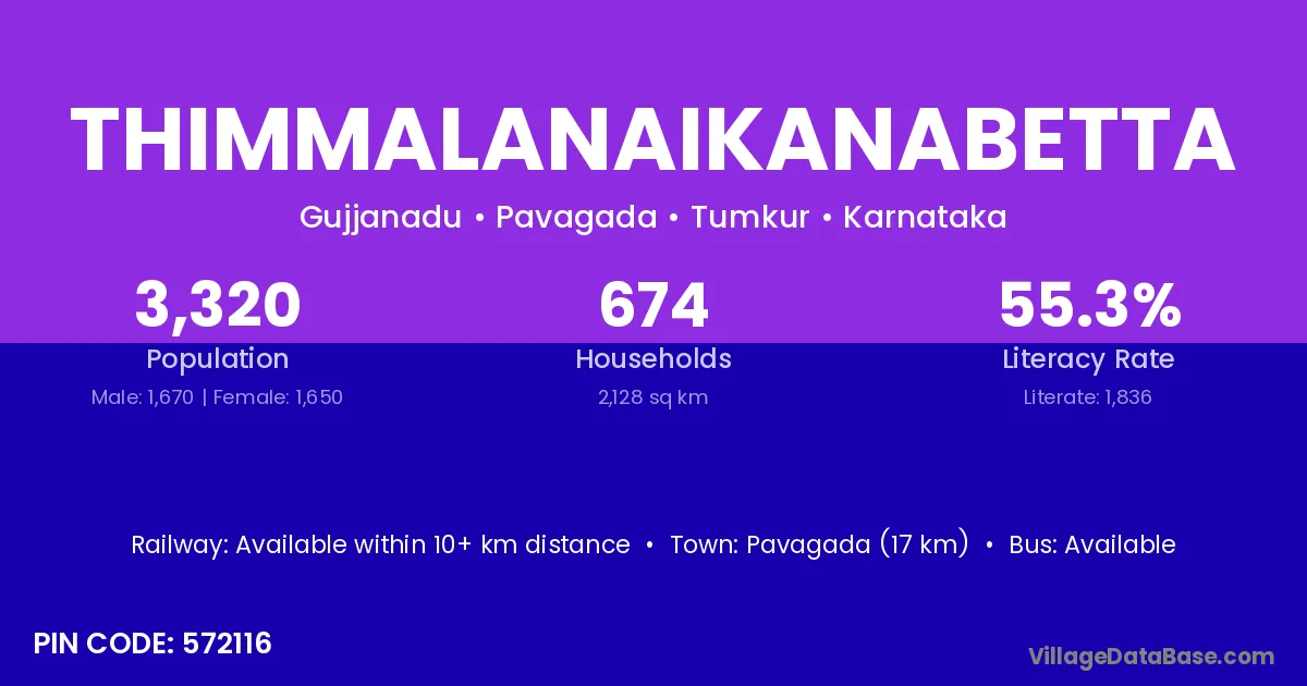 Pavagada (17 km) is the nearest town to Thimmalanaikanabetta village for major economic activities and is located approximately 17 km away.