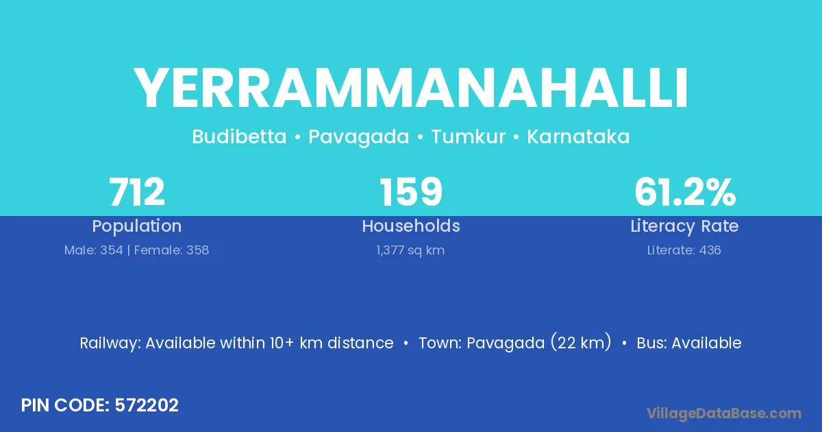 Pavagada (22 km) is the nearest town to Yerrammanahalli village for major economic activities and is located approximately 22 km away.
