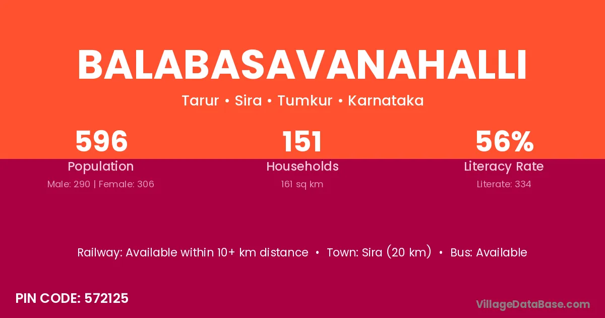 Balabasavanahalli village has a total population of 596 people, of which 290 are males and 306 are females.