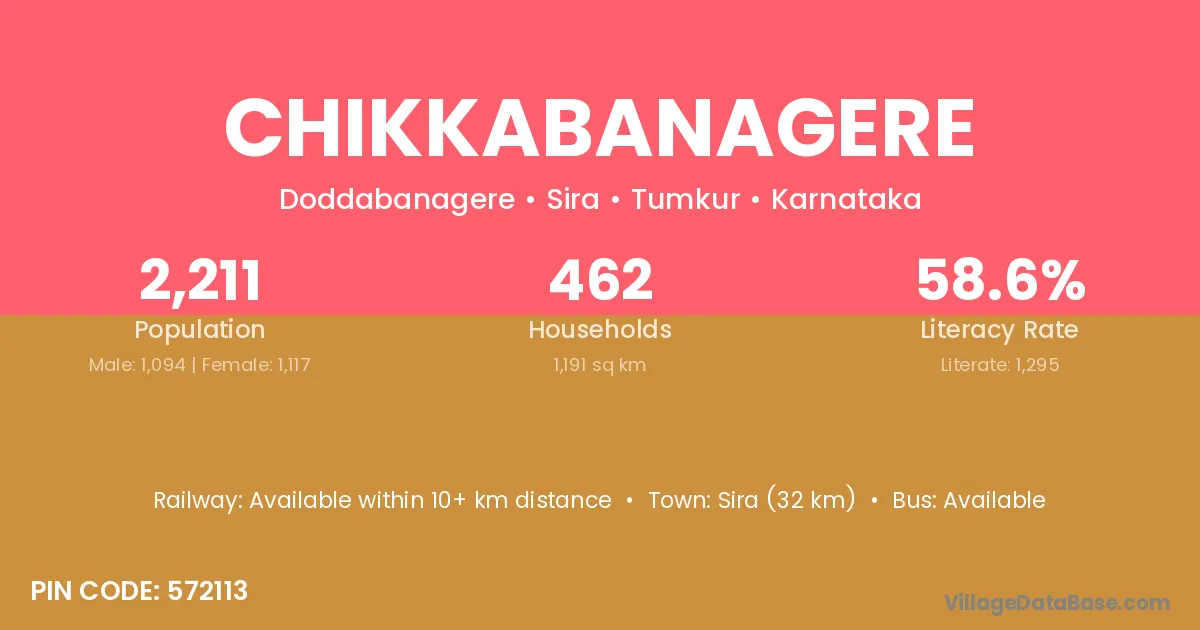 Sira (32 km) is the nearest town to Chikkabanagere village for major economic activities and is located approximately 32 km away.