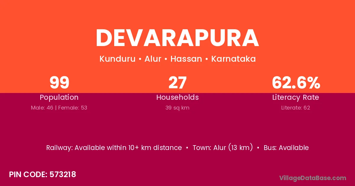 The literacy rate of Devarapura village is 61.54%. Male literacy stands at 71.88% and female literacy at 50.42%.