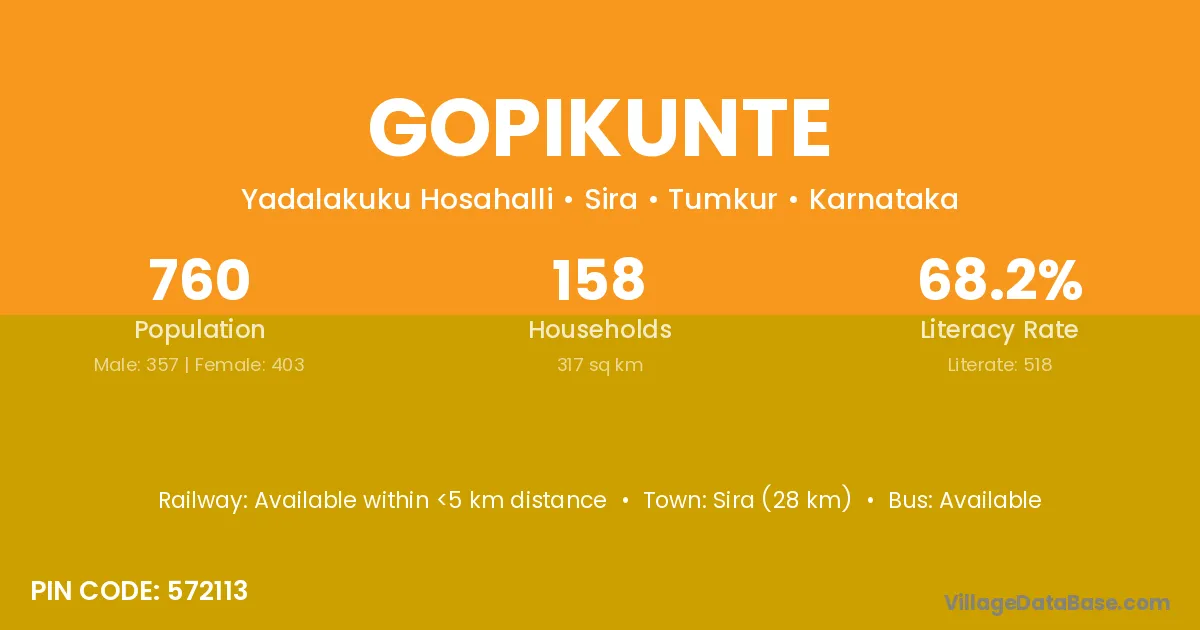 Sira (28 km) is the nearest town to Gopikunte village for major economic activities and is located approximately 28 km away.