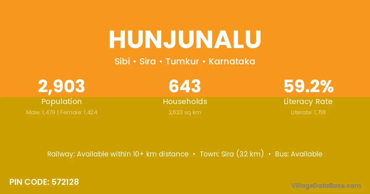 Sira (32 km) is the nearest town to Hunjunalu village for major economic activities and is located approximately 32 km away.