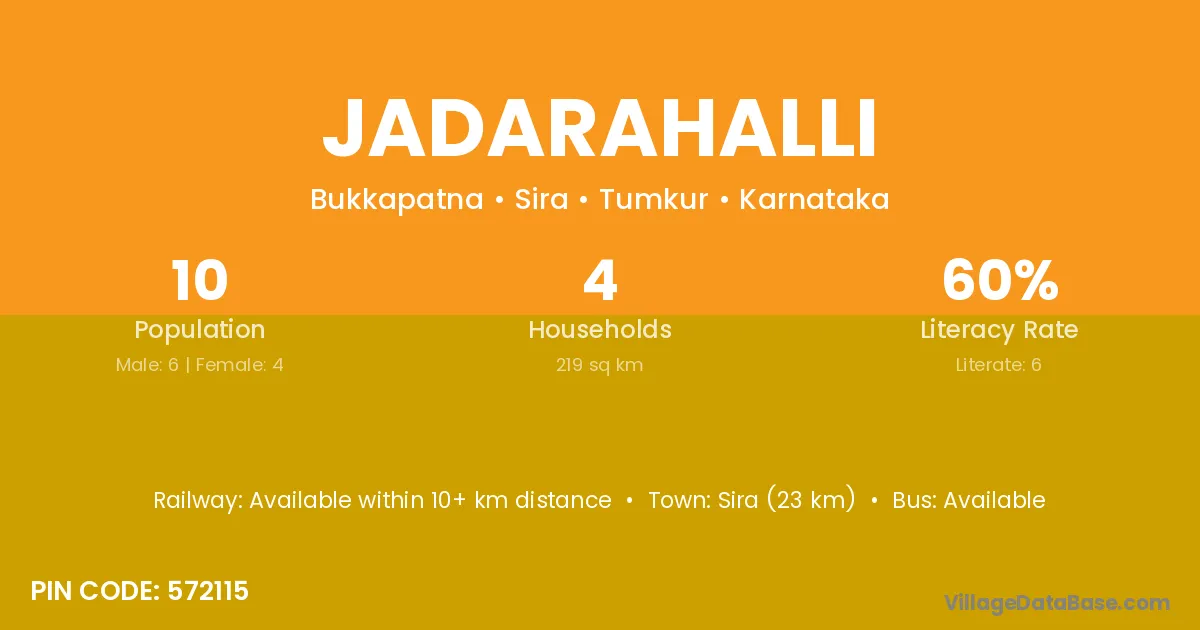 Jadarahalli village has a total population of 10 people, of which 6 are males and 4 are females.
