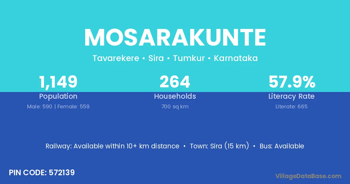 Sira (15 km) is the nearest town to Mosarakunte village for major economic activities and is located approximately 15 km away.