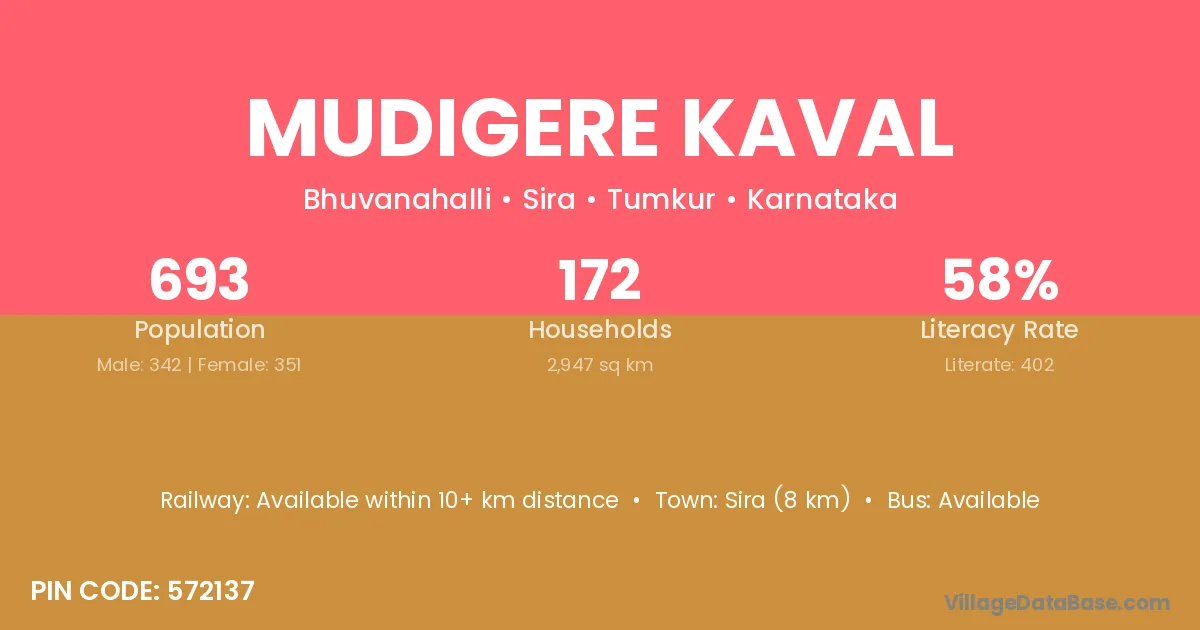 Sira (8 km) is the nearest town to Mudigere Kaval village for major economic activities and is located approximately 8 km away.